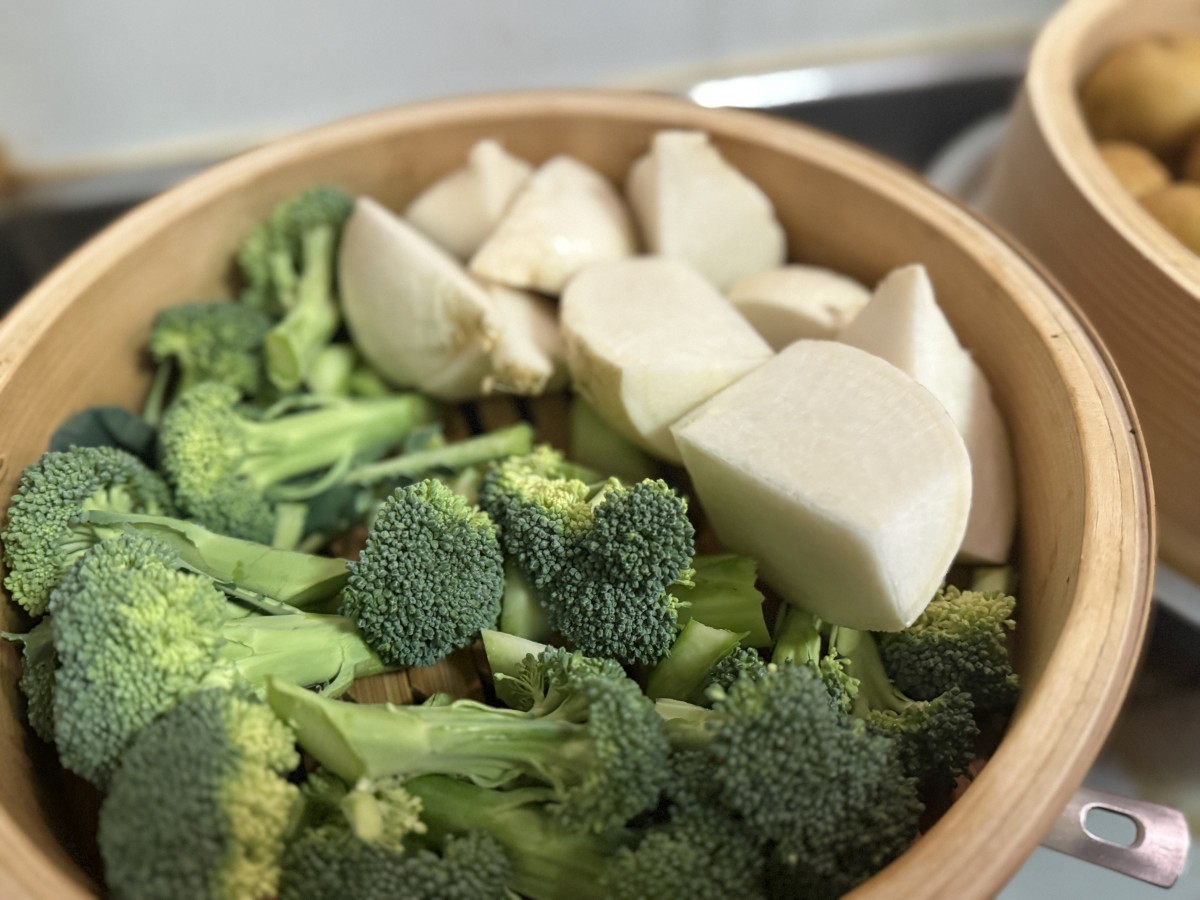 実家からお米と一緒にお裾分けしてもらった、野菜。葉物が7種あって、追いかけっこのように食べている。今日はカブとブロッコリーとじゃがいも、里芋をせいろで蒸しました。