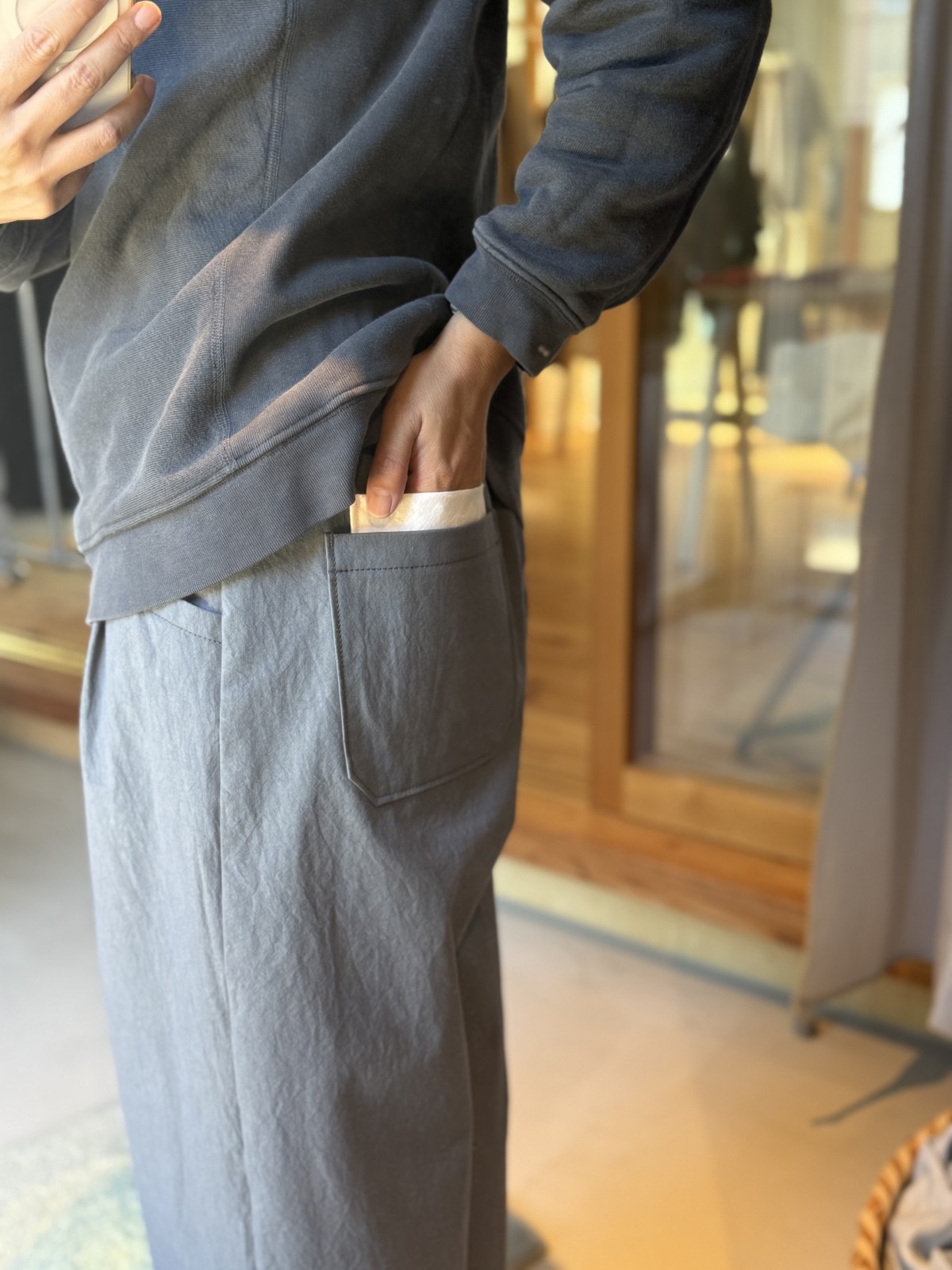 101は今日もOPEN DAYなので、エッグパンツを試着させてもらった。さらっとした生地に見えたから、わたしのハードな着倒しに耐えられるのか心配で聞いてみたら「馬布(ばふ)っていう、乗馬の鞍の下に敷いていた強い生地だから大丈夫」と言われほっとする。色はグレーに決めた。ポッケに白がちらりと見えてかわいい。ほら!